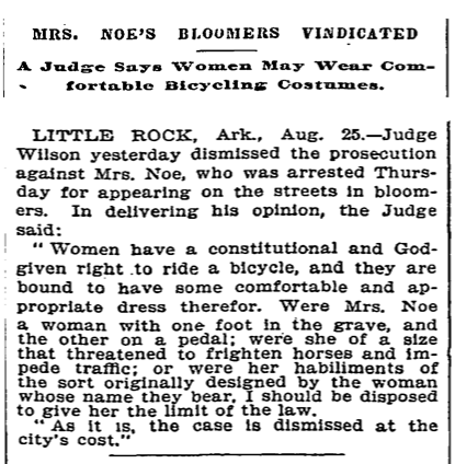 Cases were brought over … BLOOMERS… in 1885 Mrs. Noe’s Bloomers were VINDICATED in Little Rock.