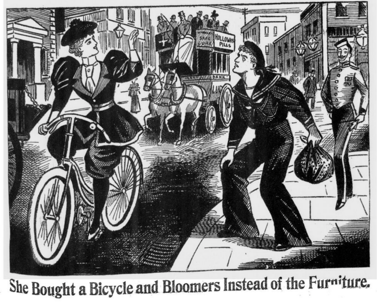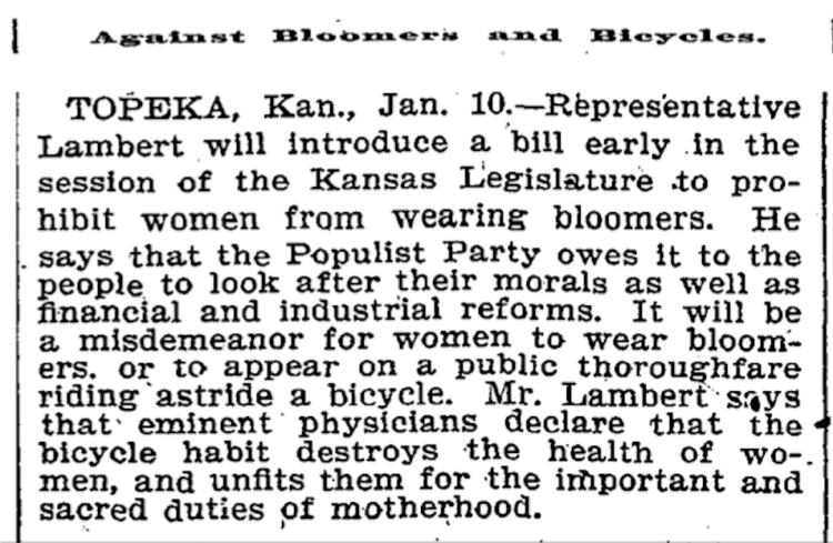 In 1895 a Kansas representative introduced a bill to PROHIBIT women from wearing bloomers on their bikes. Men, including physicians, argued that cycling “destroys the health of women” and “unfits them for the important and sacred duties of motherhood…”