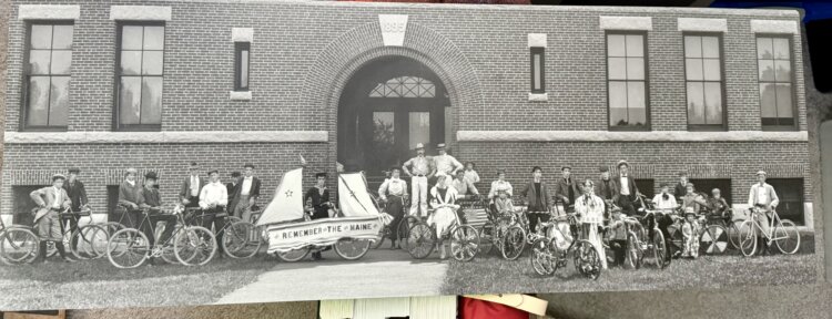 I also added a glass negative from a photo taken in the early 1900s of a group of cyclists at a parade or memorial event – the theme was REMEMBER THE MAINE -with one fellow in his best Teddy Roosevelt costume… a reminder that cycling and POLITICS were intermingled early on. I found the glass negative on eBay & had it printed on metal.